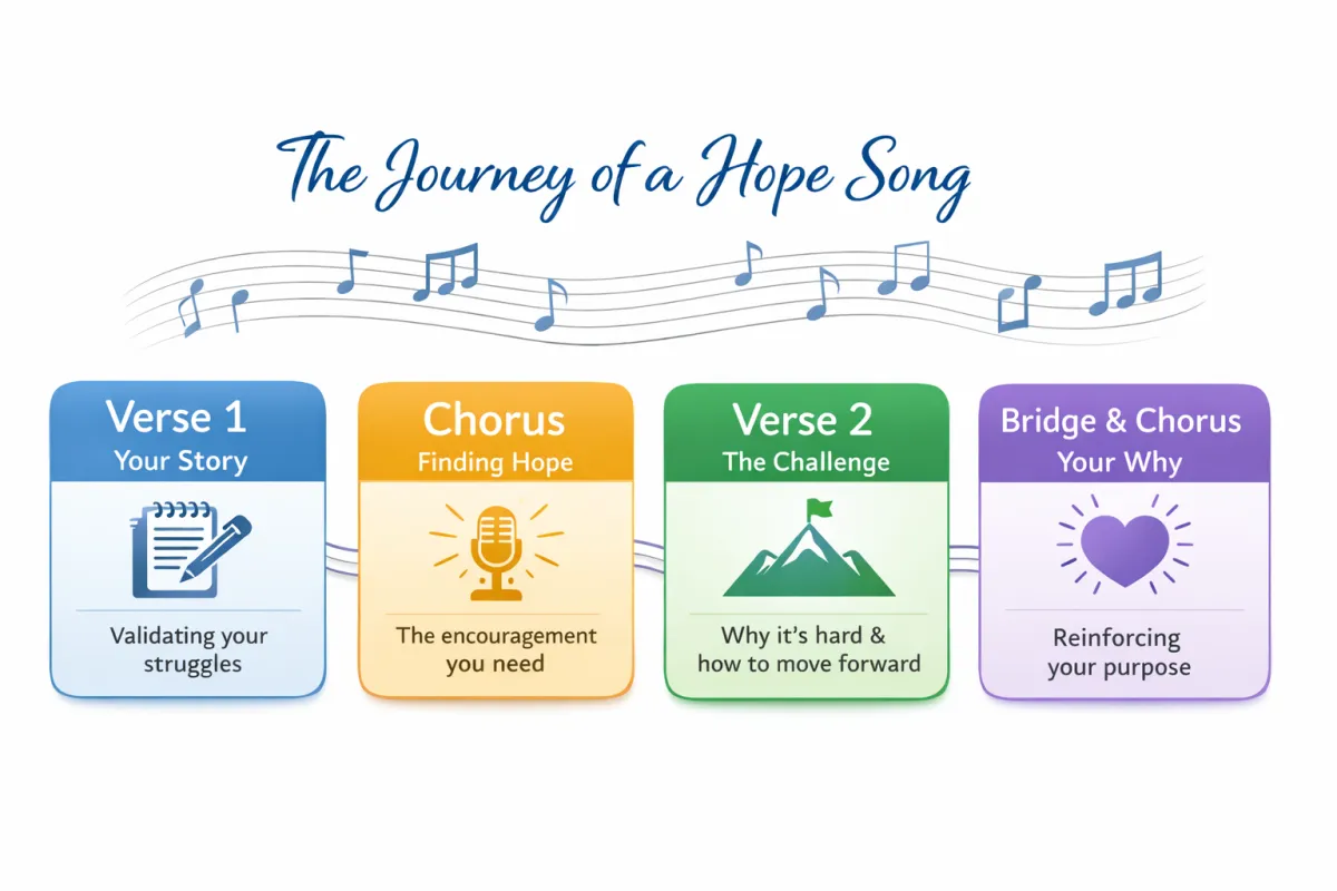 Your Song is Created – I craft your Hope Song, blending your story, the message, and music that can help the message reach your heart.